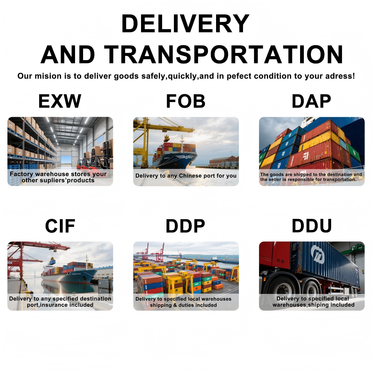 Price terms: EXW, FOB, C&F, CIF, DAP, DDP, DDU